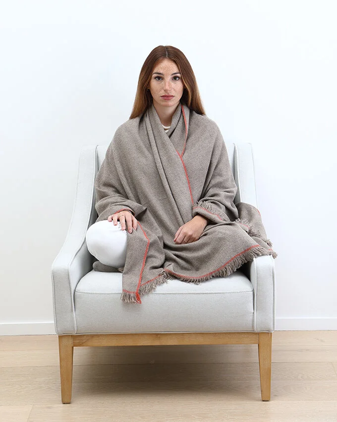 D’un blanc immaculé entièrement issu du duvet naturel des chèvres. En sergé classique, il garde toute les qualités authentiques et la pureté unique de cette fibre rare.