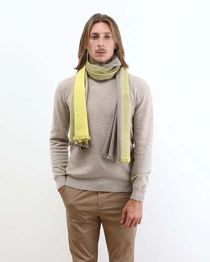 Longzey est une écharpe en tissage classique avec un design atypique qui alterne sur sa chaine les fils naturels et les fils teintés d'alizarine. Tandis que sa trame est entièrement constituée de fils blanc naturels, couleur d'origine de la fibre.