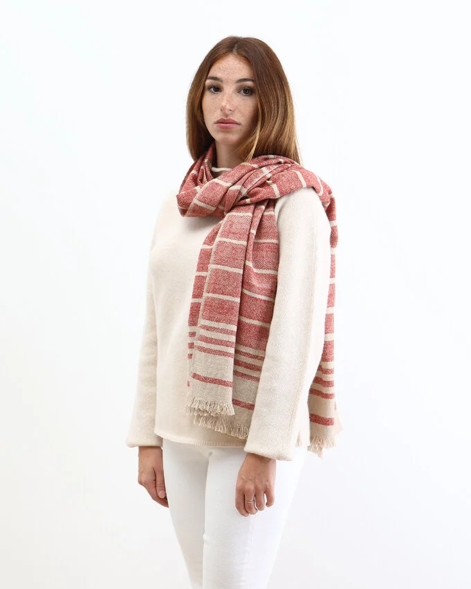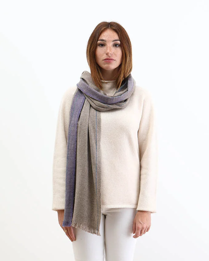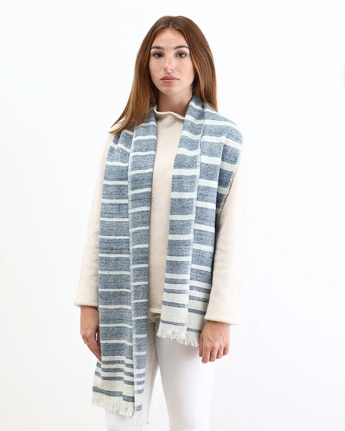 Tissée avec un délicat motif en zig zag entrelaçant des fils beige naturel et des fils teinté avec de l'indigo naturel, cette écharpe va vous étonner par son allure et son élégance.